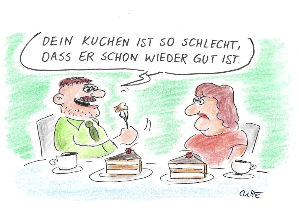 Die Zeichnung enthält einen maltechnischen Fehler. Sein Kuchenstück ist noch unversehrt, er hat aber einen Happen davon auf der Kuchengabel.